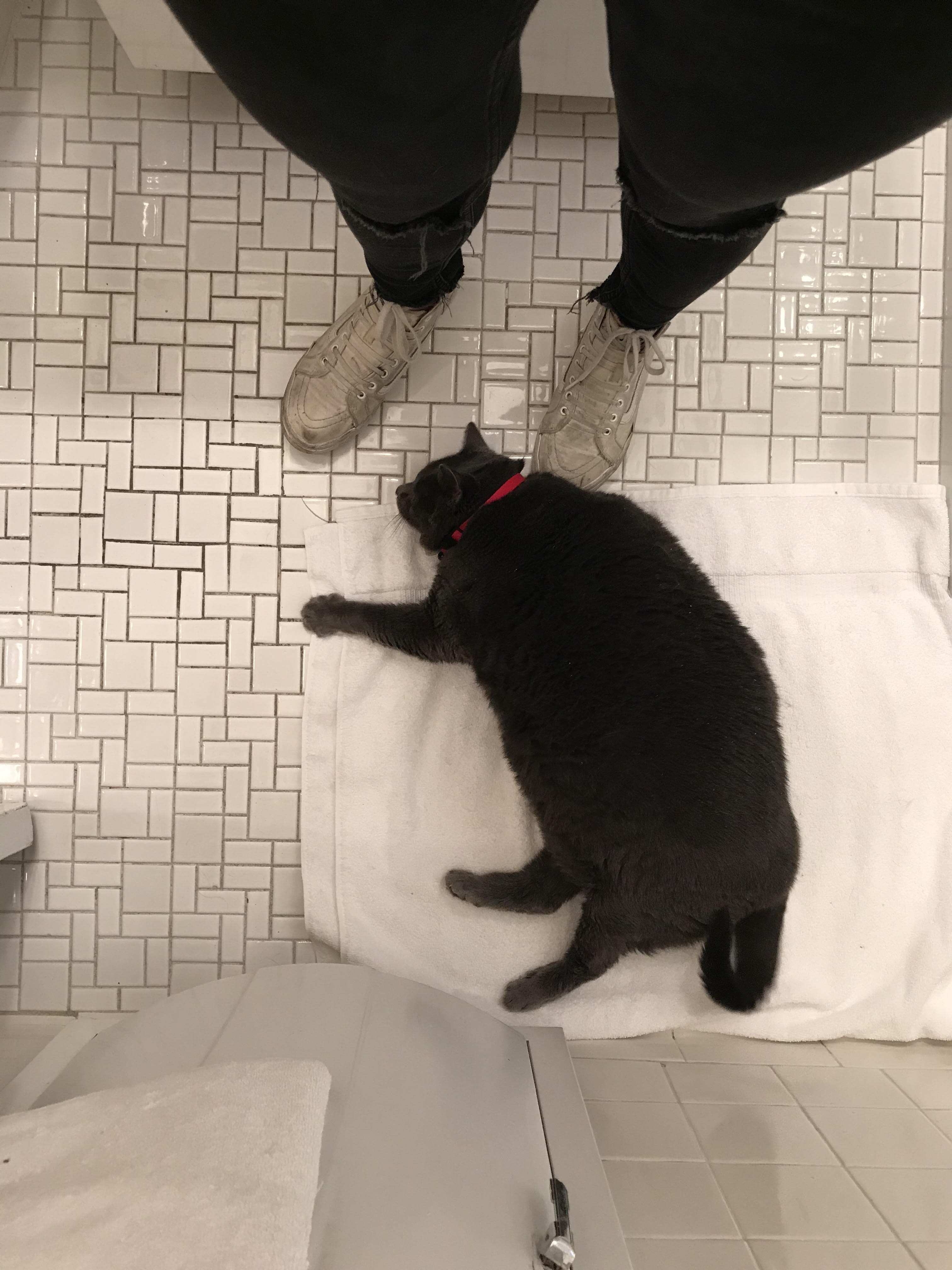 After emailing my interest for Gertie, then she was called Simone, I met her at her foster mom’s apartment where her diet had begun. Walking in and seeing her girth for the first time was shocking! She has a normal sized cat head on this huge rectangular, gray body. Immediately I wanted her. Once the paperwork was done and we got home, she was very curious and wandered all around my apartment. She is one of the mot adaptable cats I’ve ever met, and I grew up with a lot of cats! Her laid back attitude does not affect the sass level, however.