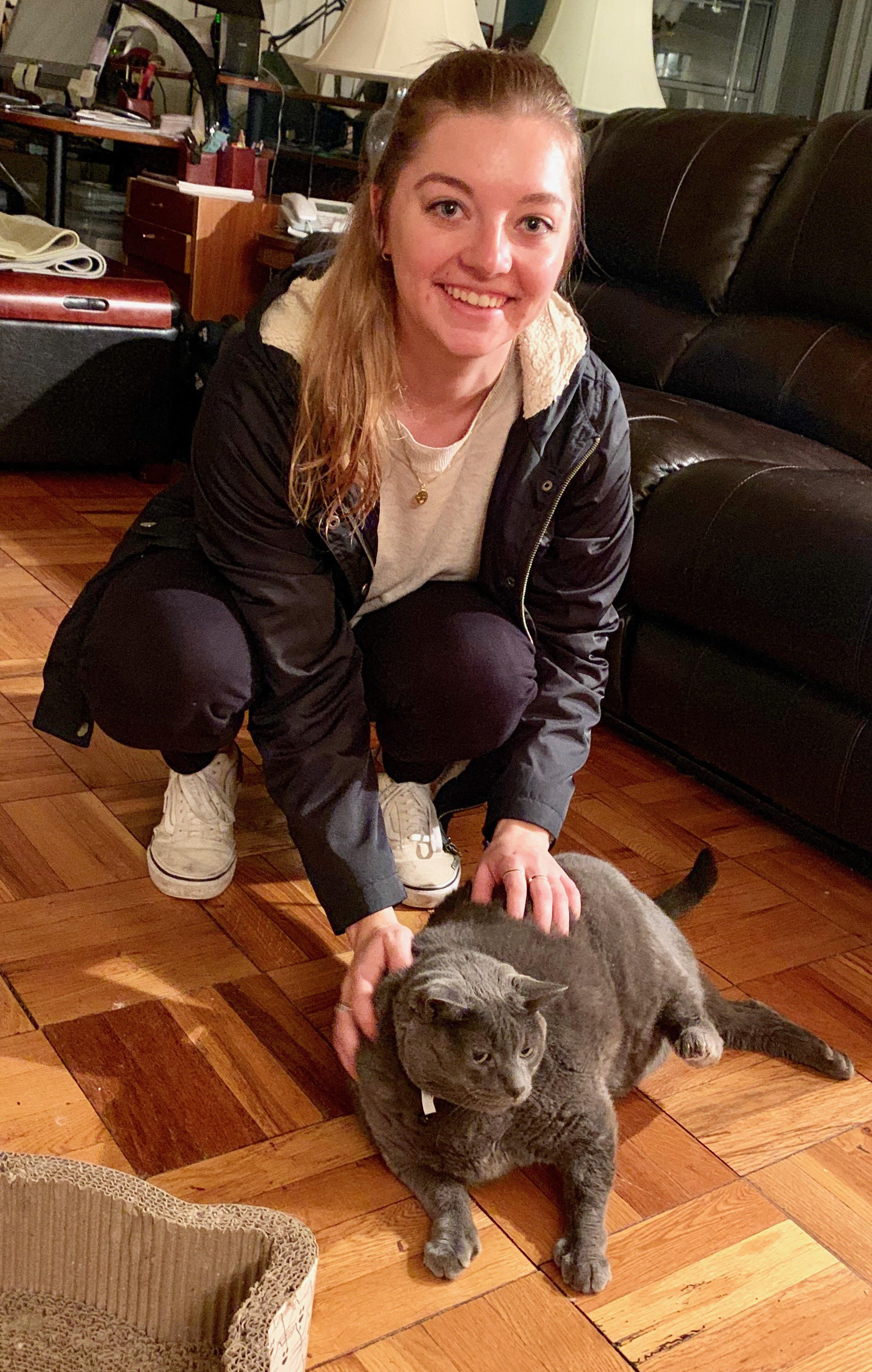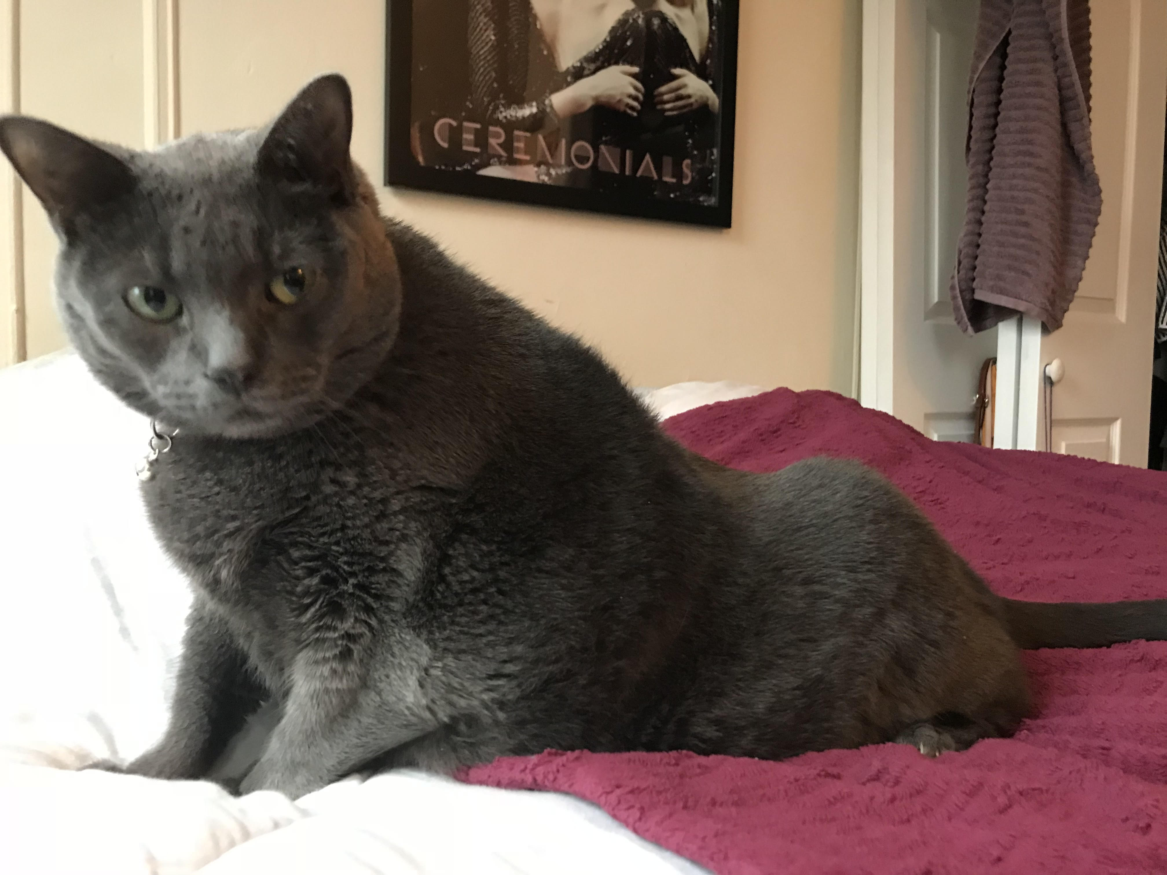 I first found Gertie by going to the APSCA cat adoption page and typing in Russian Blue. My roommate has some allergies to cats and the Russian Blue produces less of the protein that makes the allergies terrible. So, as I looked through the adoption page of Russian Blue cats available for adoption in NYC I saw that one of the cats was labeled as “extremely overweight.” Intrigued, I clicked on it and read her story. She seemed to be from a loving home that the couple became too elderly to take care of her and had just left food for her at all times. I’m sure they loved her because she is a happy eater, and the weight did not put itself on her!